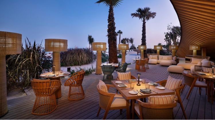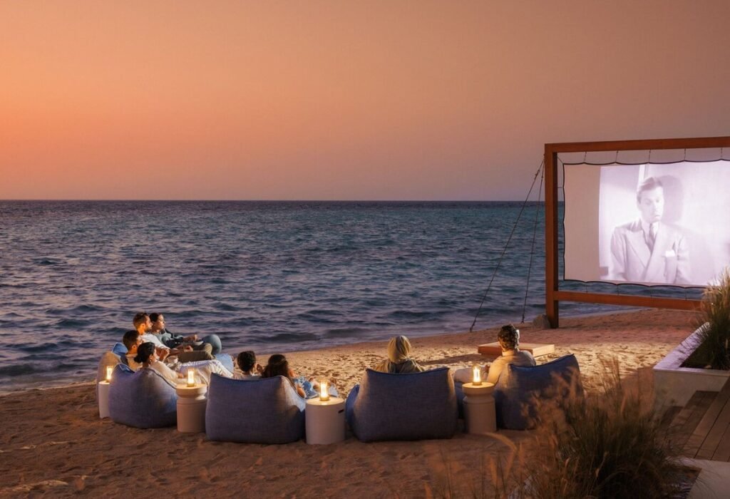 The villas are relaxed and informal, with soft colors, arched ceilings, and a lived-in feel. There’s a diwaniya lounge over the water, an outdoor cinema, and a beach bar serving non-alcoholic drinks at sunset.