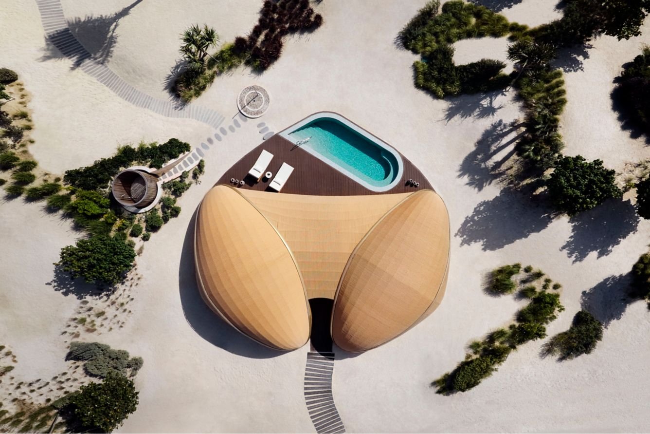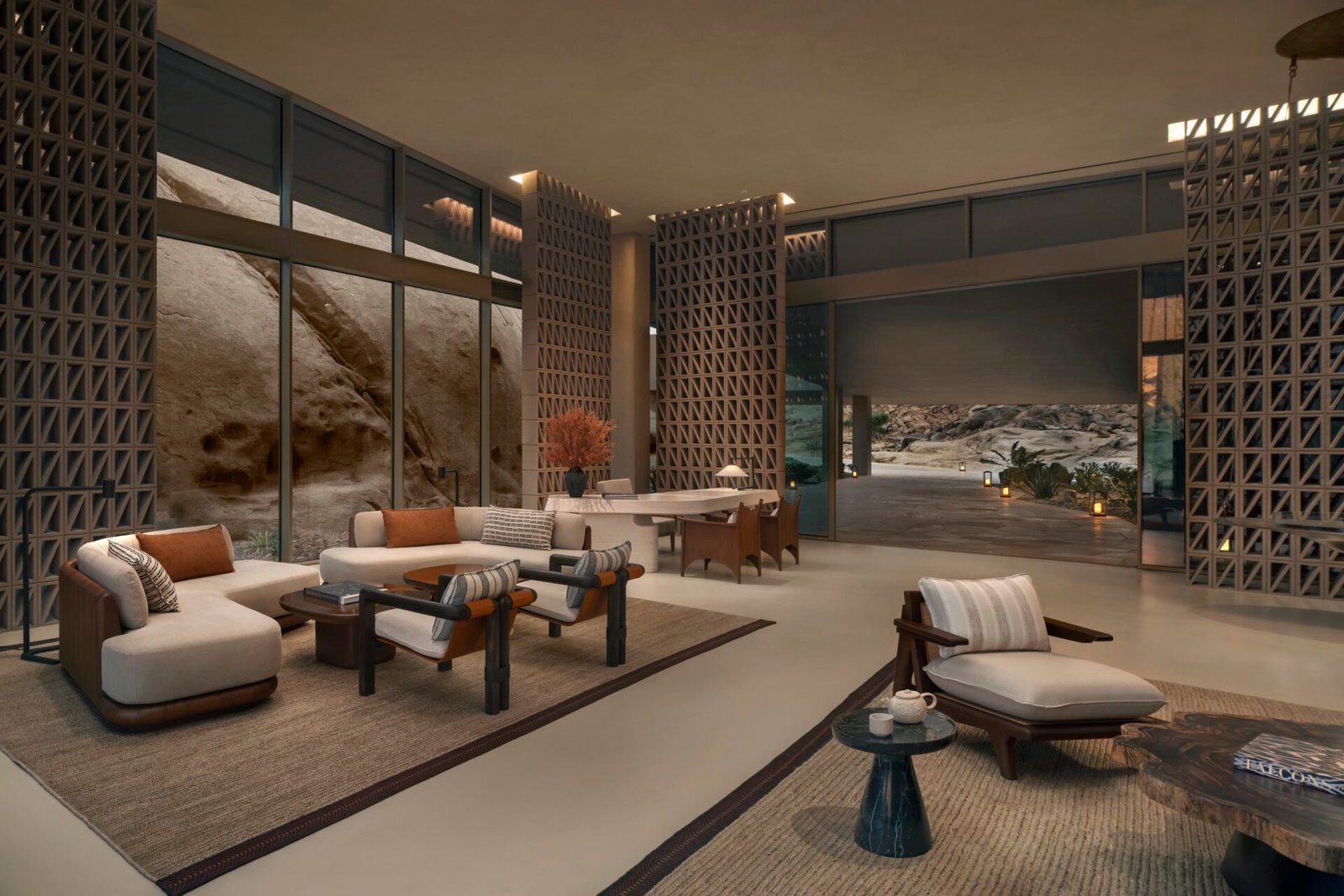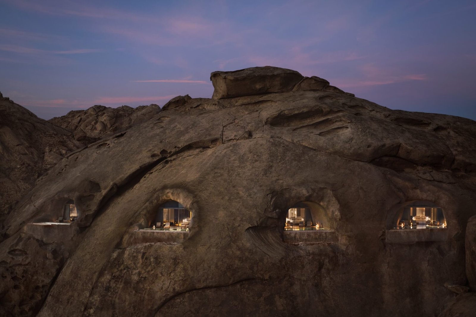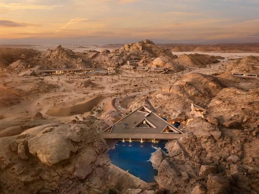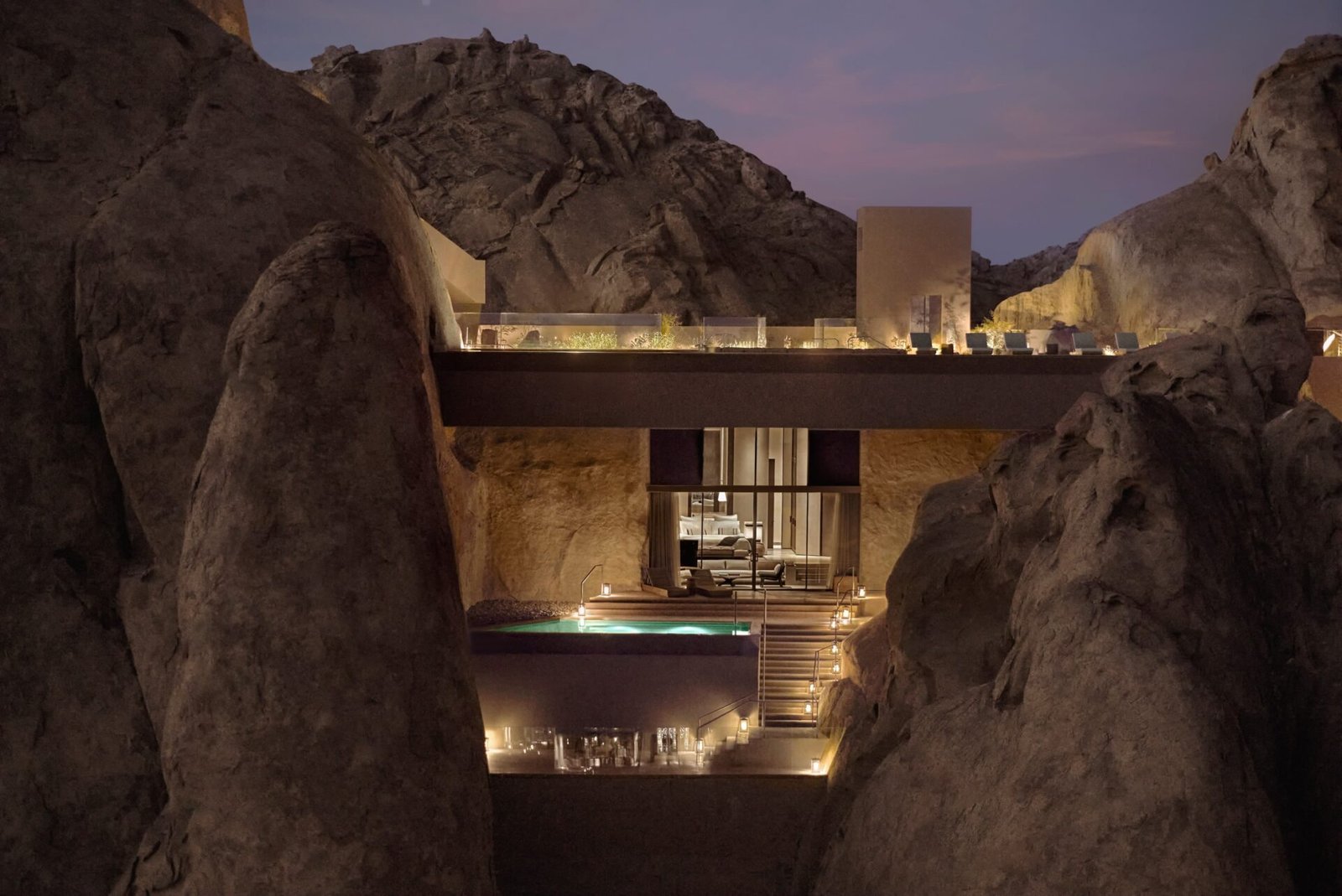 Desert Rock takes a completely different approach. Instead of building on the coast, it’s set inland among ancient rock formations. Designed by Oppenheim Architecture, the resort is carved directly into the cliffs, with villas that feel more like part of the landscape than additions to it.