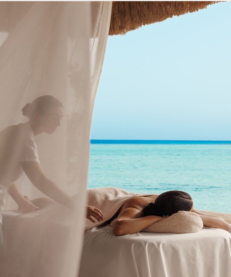 Days tend to be slow and water-centered—snorkeling over shallow reefs, swimming, or simply lingering over breakfast. Later, there’s e-foiling, spa treatments, or nothing at all. Dining is spread across a few focused venues, including Japanese-Peruvian at Iki.Roe and Italian at Ariamare. The resort runs entirely on solar power and, despite its dramatic design, feels calm rather than showy.